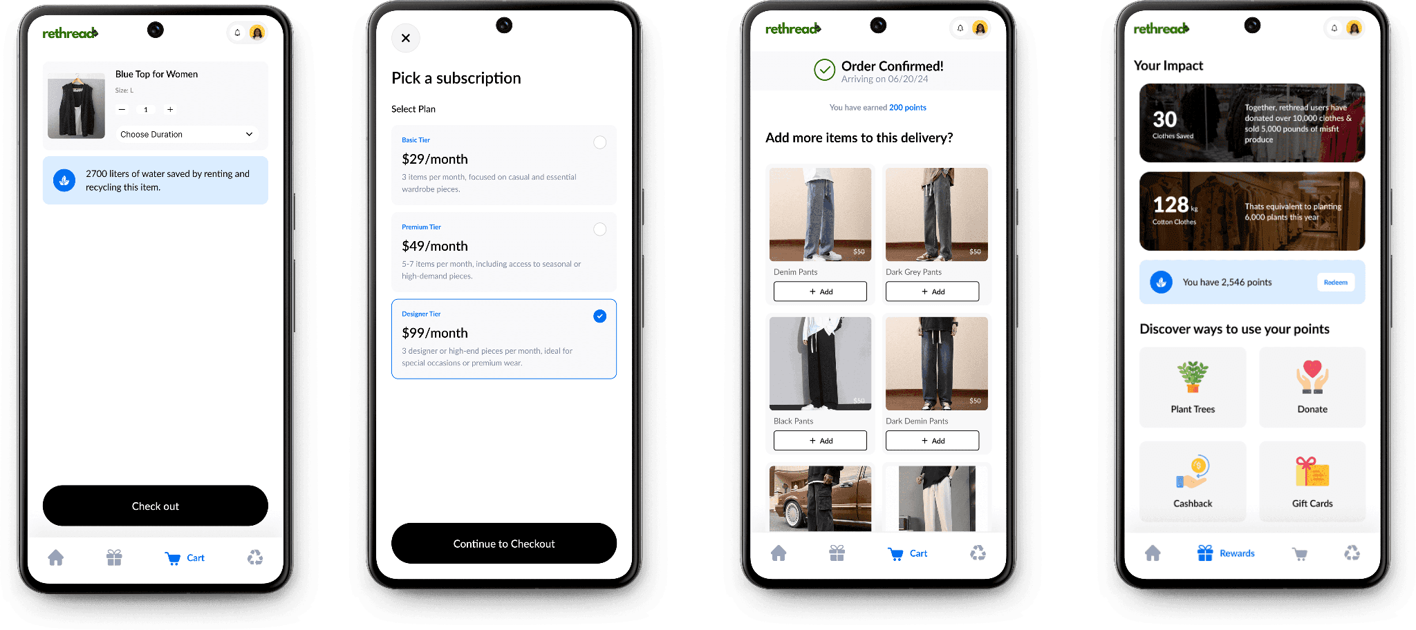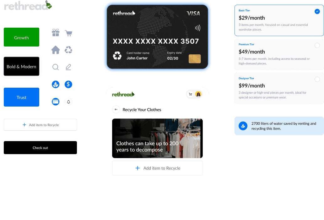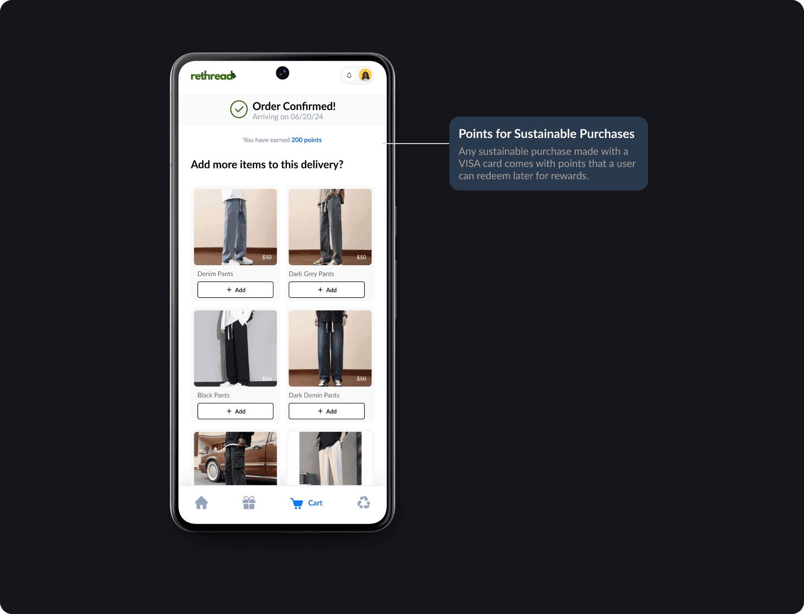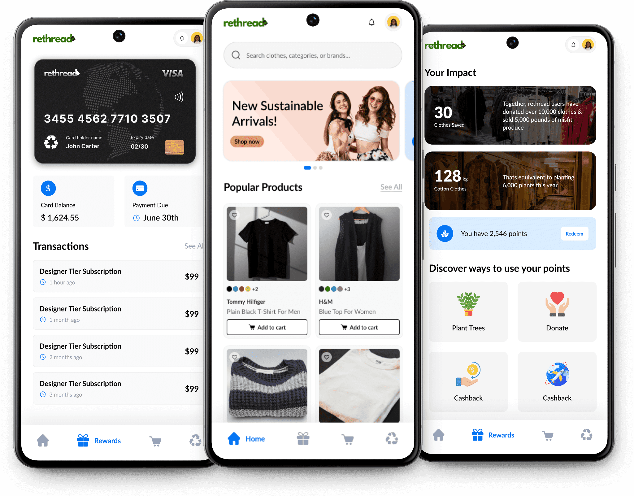 As a part of Visa Climate Tech Hackathon 2024, we developed ReThread, a conceptual digital platform promoting sustainable fashion by encouraging clothing reuse and recycling. In partnership with Visa, it rewards eco-friendly purchases made using a Visa card, supporting a circular fashion economy.