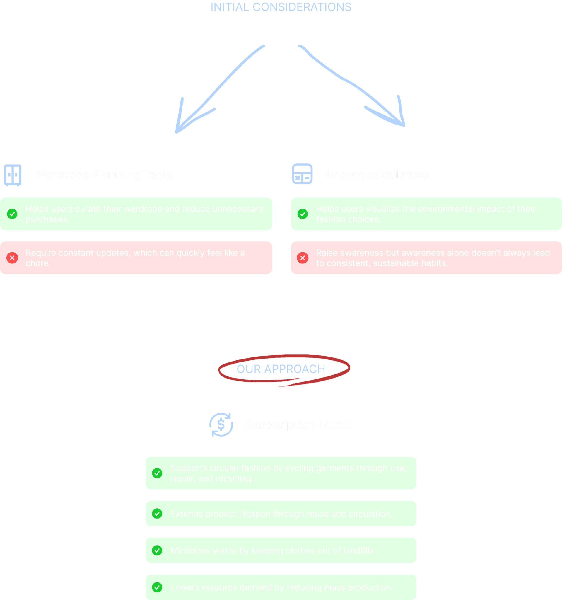 To innovate for sustainable fashion, we explored various concepts to see which best addressed consumer needs while promoting convenience, affordability, and environmental impact.