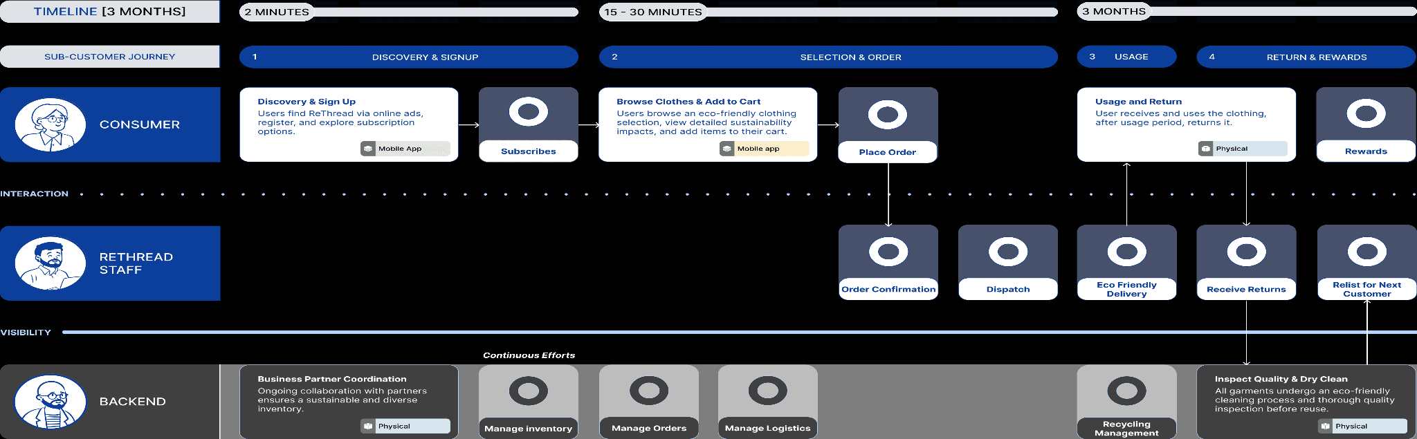 We developed a high-level service blueprint for ReThread to map out the core elements of our business functions, providing a clear visualization of operational workflows.
